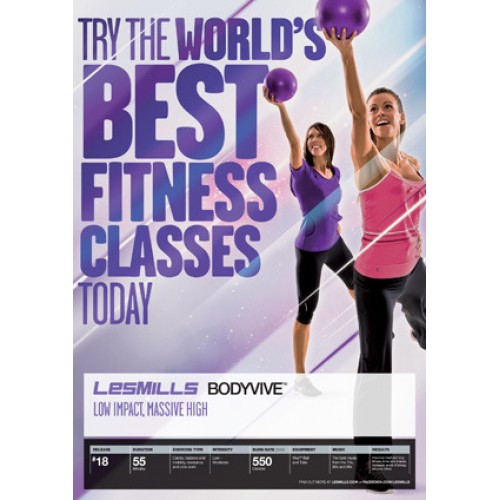 BODYVIVE™ is the low-impact, whole body group fitness workout that uses VIVE™ balls, VIVE™ tubes and body weight to boost fitness and core strength. There are inspirational instructors and music to motivate you. Best of all, you're left fizzing with energy, so you can really take life on! Like all the LES MILLS™ programs, a new BODYVIVE™ class is released every three months with new music and choreography.